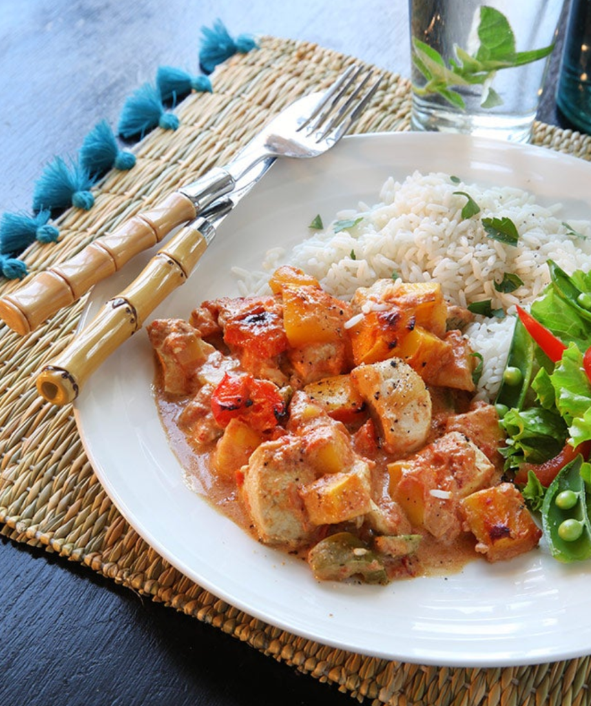 - Koka upp matlagningsbas, krossade tomater, curry, sambal, buljongtärning och pressad vitlök. Smaka av med salt och peppar. Häll såsen över kycklingen. Sätt in i ugnen ca 20 minuter.